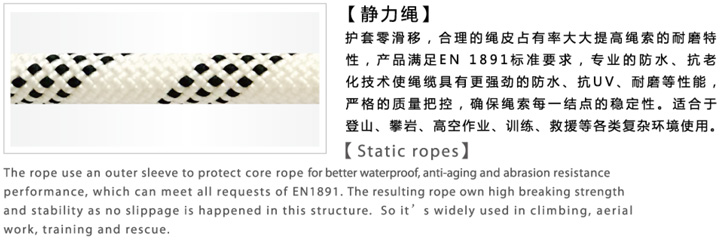 護套零滑移,合理的繩皮占有率大大提高繩索的耐磨特性,產品滿足EN1891標準要求,專業的防水,抗老化技術使繩纜具有更強勁的防水、抗UV,耐磨等性能,嚴格的質量把控,確保繩索每一個結點的穩定性。適合于登山、攀巖、高空作業、訓練、救援等各類復雜環境使用。