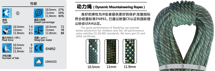 具有良好的彈性,能夠減緩沖擊力,吸收墜落能量,為登山、戶外運動,高空做作業人員提供更好的保護。產品滿足EN892標準要求,追求更優異的沖擊力,更高的墜落次數以及更小的重量。適合存在墜落系數大于1等風險領域使用。